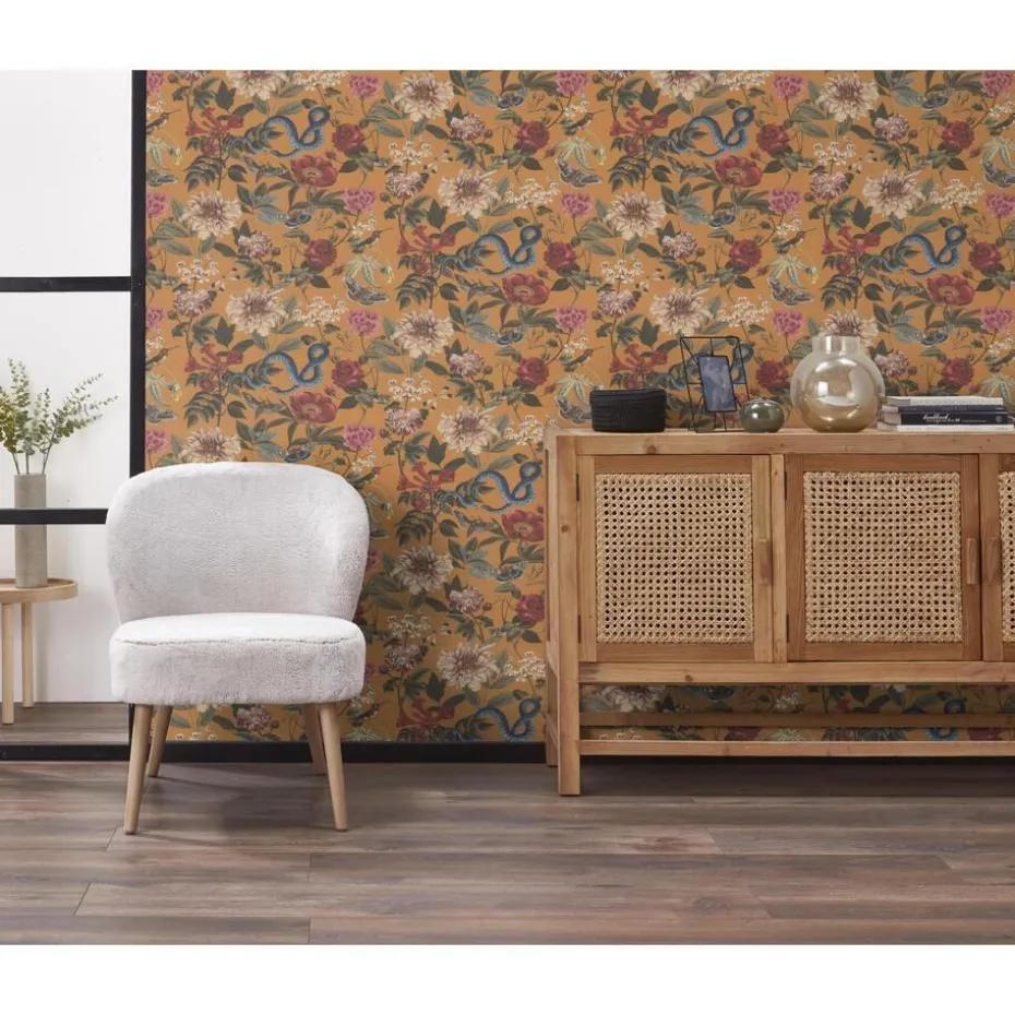 Vliesbehang met fleurige bloemenprint. Voorzien van het FSC-keurmerk. Wand insmeren met Perfax Roll-on. 10 meter per rol. 53 cm breed.