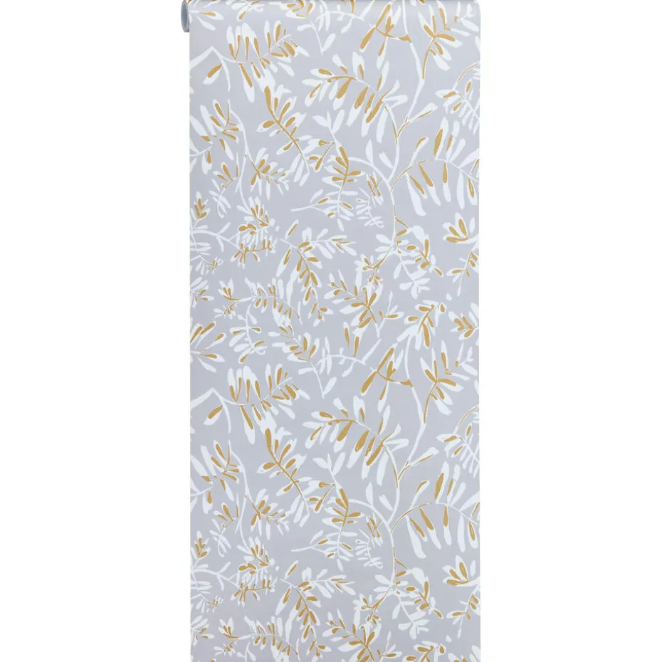 Vliesbehang Bloss in sfeervolle grijze en okergele kleur met een prachtig bladeren patroon.Het behang is voorzien van het FSC-keurmerk. Plakken met Perfax Pink. 10 meter per rol.