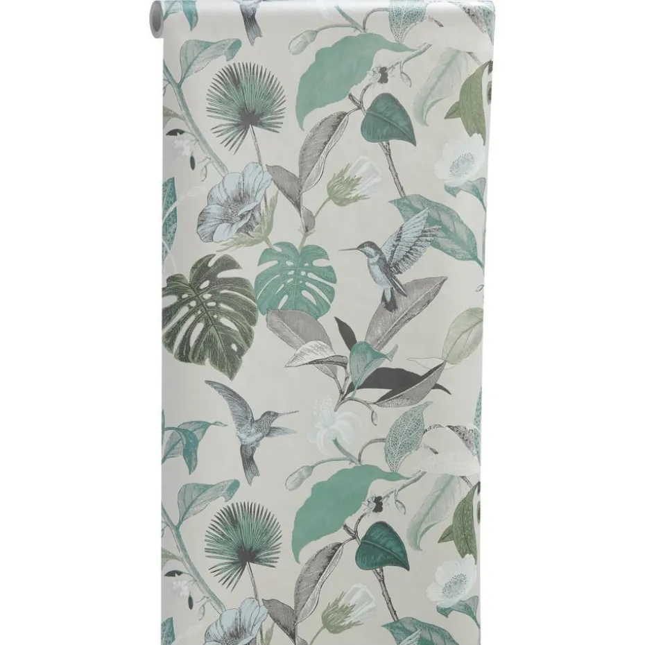 Vliesbehang multicolor met botanisch dessin van bloemen en vogels. Plakken met Perfax Roll-On.