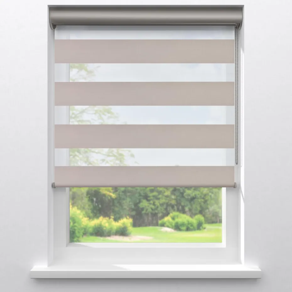 Duo rolgordijn Emiel is in een warme beige kleur. Het duo rolgordijn is opgebouwd uit afwisselend transparante en ondoorzichtige banen. Met een soepel ketting systeem bepaal je zo lichtinval, verduistering, en de mate van privacy. Het materiaal is gemaakt van polyester. Zo is het duo rolgordijn behoorlijk slijtvast, en is het gemakkelijk schoon te maken met een vochtige doek.
