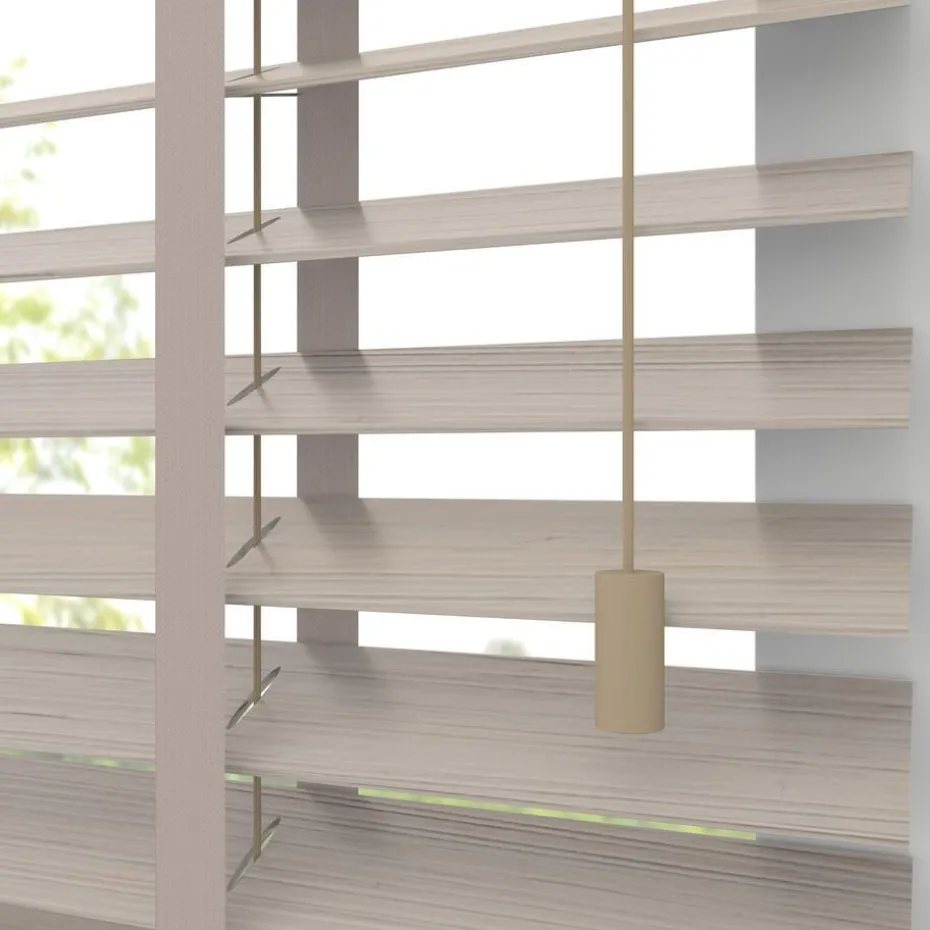 Houten jaloezie zandkleurig. 100% bamboe. De brede lamellen van 50 mm zorgen voor veel lichtinval en bieden veel privacy wanneer je deze sluit. Op maat te maken en volledig naar wens samen te stellen. Bepaal zelf de bedieningszijde en kies uit diverse accessoires en uitvoeringen. Keuze uit een bijpassend ladderkoord, 48 verschillende ladderbanden en een koordhanger van hout, rvs of zwart metaal.