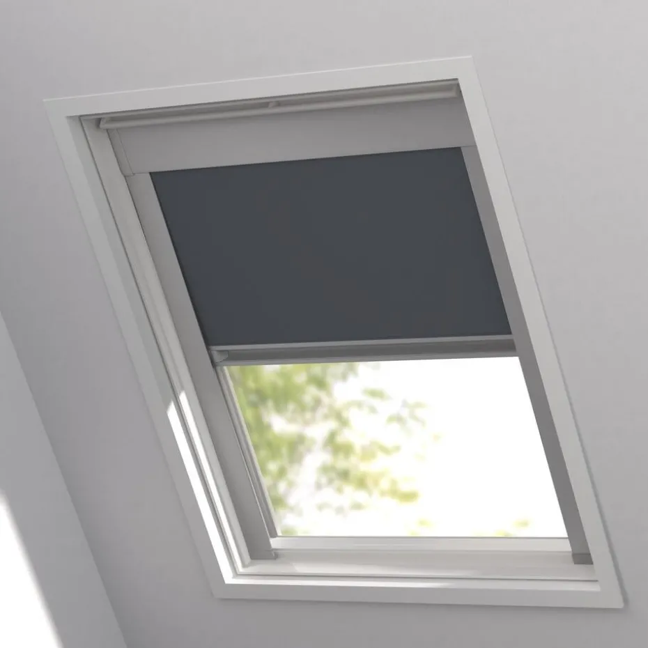 Dakraamrolgordijn antracietkleurig. Ideaal voor zolders en slaapkamers. De zilverkleurige coating aan de achterzijde zorgt voor volledige verduistering en reflecteert de warmte. De stof is vochtbestendig. Met de handmatige bediening bepaal je zelf hoeveel licht je binnen wilt laten. Uitgevoerd met RVS aluminium cassette, zijprofielen en onderlat. Af te nemen met een vochtige doek. Geschikt voor ramen van Velux, Fakro en Rooflite.