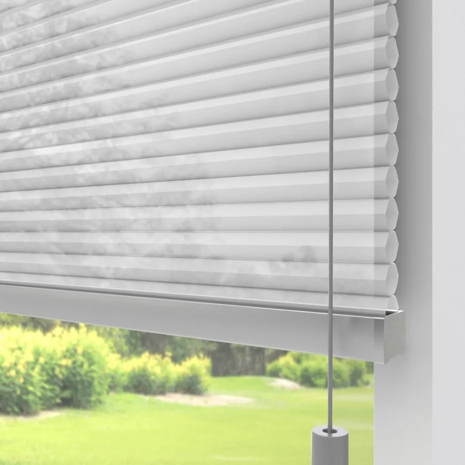 Lichtdoorlatende dubbele plissé wit met fijne structuur en witte achterzijde. De dubbel geplooide stof met een honingraatstructuur zorgt voor extra isolatie. De koorden zijn verwerkt in de honingraat en zijn niet zichtbaar. Verkrijgbaar als top down, top down bottom up of top down bottom up gespannen. Een top down bottom up gordijn kan zowel aan de bovenkant als de onderkant worden uitgevouwen voor volledige controle over de gewenste lichtinval en privacy. Een gespannen plissé is zeer geschikt voor draaikiepramen omdat de stof goed op zijn plek blijft. Op maat te maken en volledig naar wens samen te stellen. Bepaal zelf de kleur van het systeem en kies uit een bijpassende koordhanger van kunststof, rvs of zwart metaal.