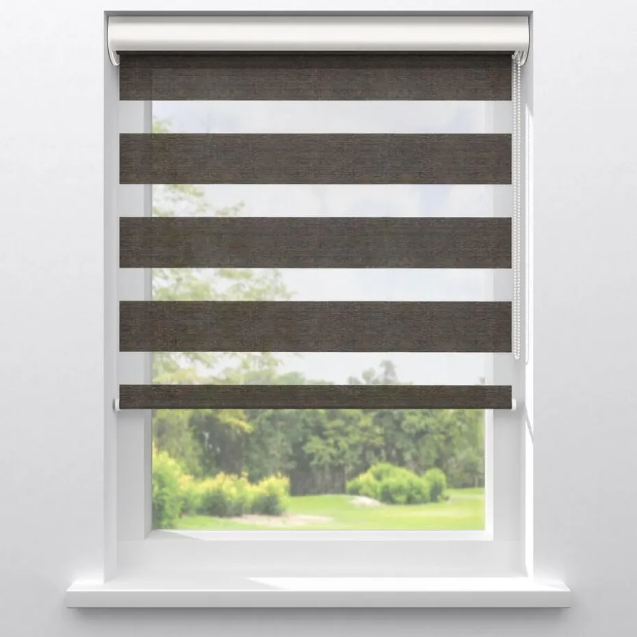 Lichtdoorlatend duo-rolgordijn bruin. De transparante banen hebben een fijne gaasstructuur. De afwisselende open en dichte stofbanen bewegen voor elkaar langs. Zo bepaal je eenvoudig de lichtinval en privacy. Je kunt zelf de kleur kiezen van de cassettes, eindkappen, kettingen, onderlatten en roedes. De bedieningszijde kies je ook zelf: rechts of links. Op maat te maken en eenvoudig met de juiste afmetingen te bestellen.