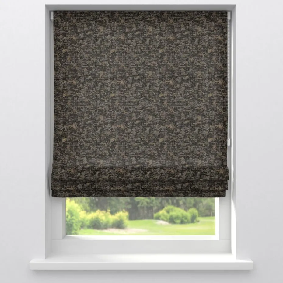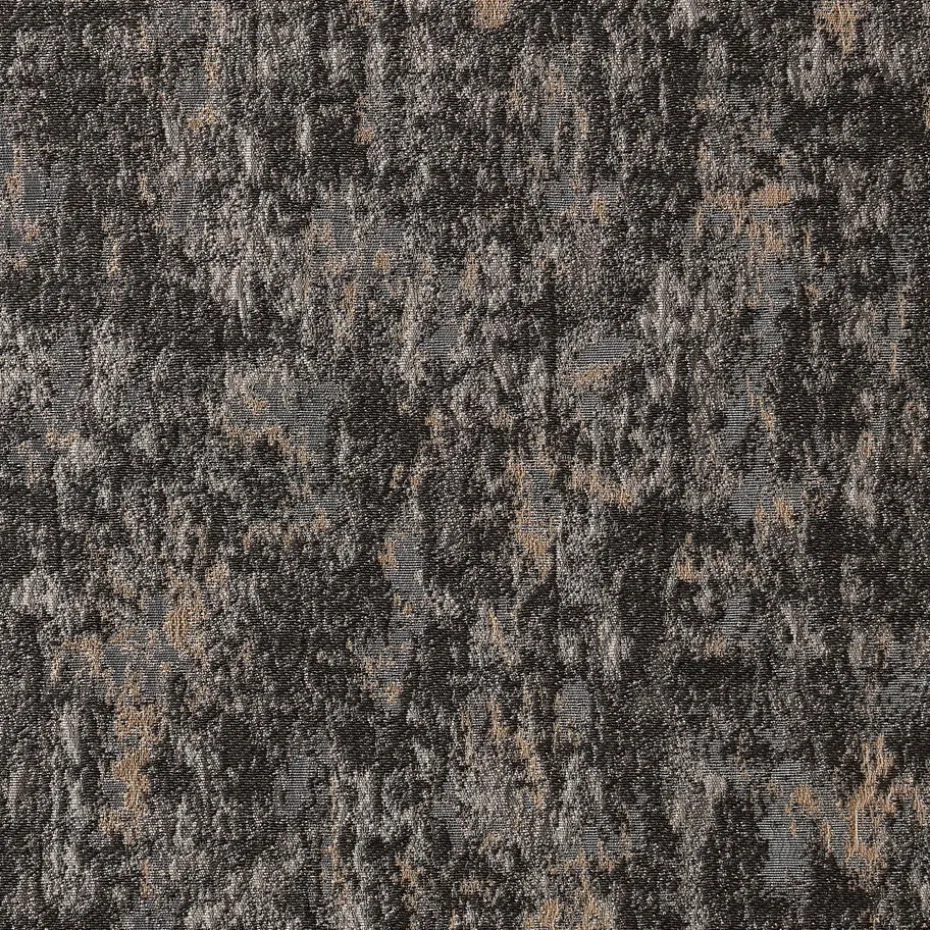 Lichtdoorlatende jaquard gordijnstof zwart met een verweerde metallic print. Stevig, vormvast en slijtvast. 145 cm breed.