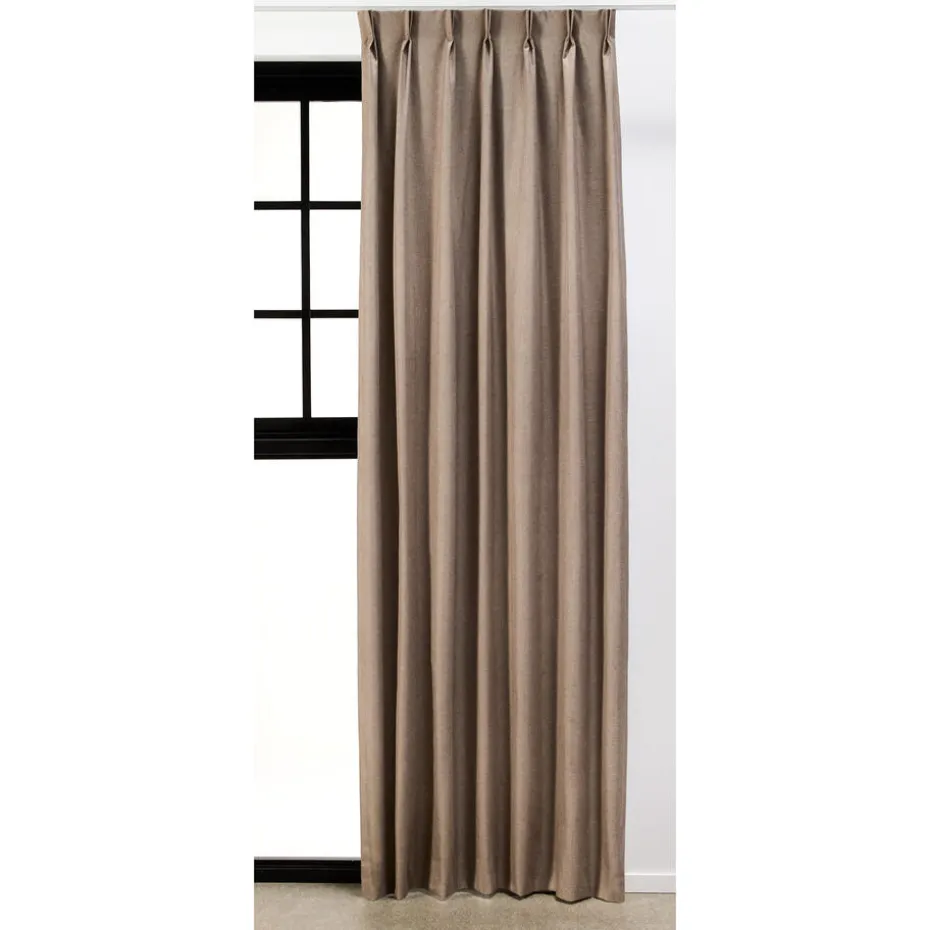 Gordijn Nina is in een warme bruine kleur. De stof is gemaakt van 100% polyester en heeft een compleet verduisterend effect, dit omdat de achterkant van de stof voorzien is van een witte blackout coating.