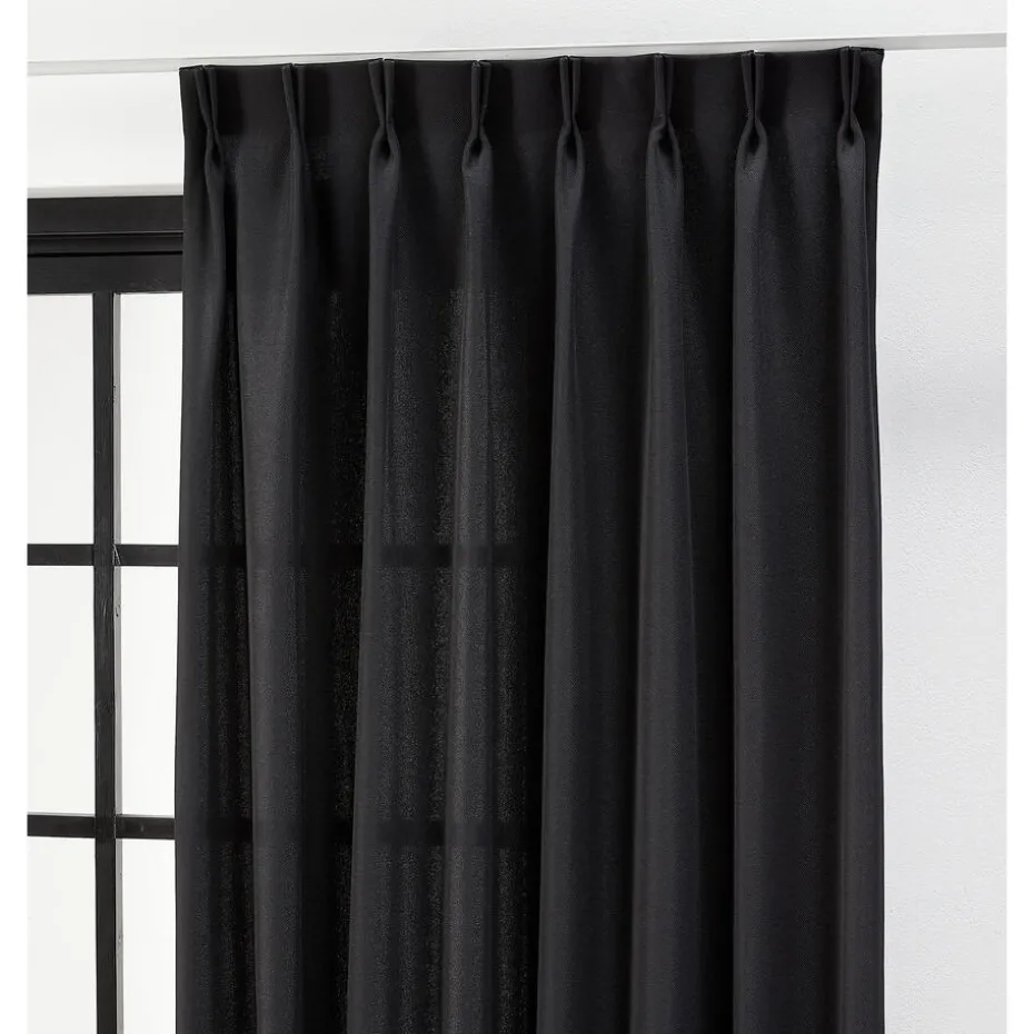Lichtdoorlatende zwarte uni gordijnstof. Dit gordijn is stevig, vormvast en valt soepel. De stof is gemaakt van 100% polyester. 150 cm breed.
