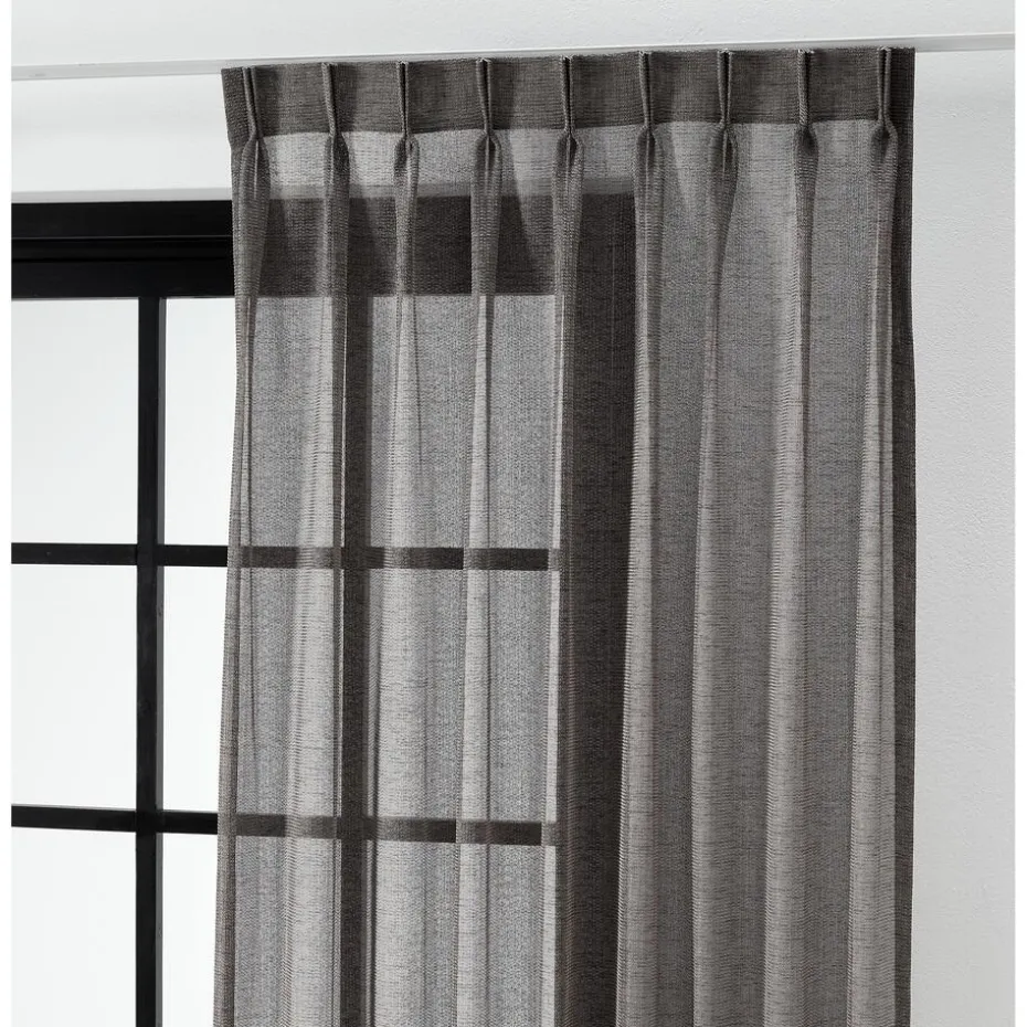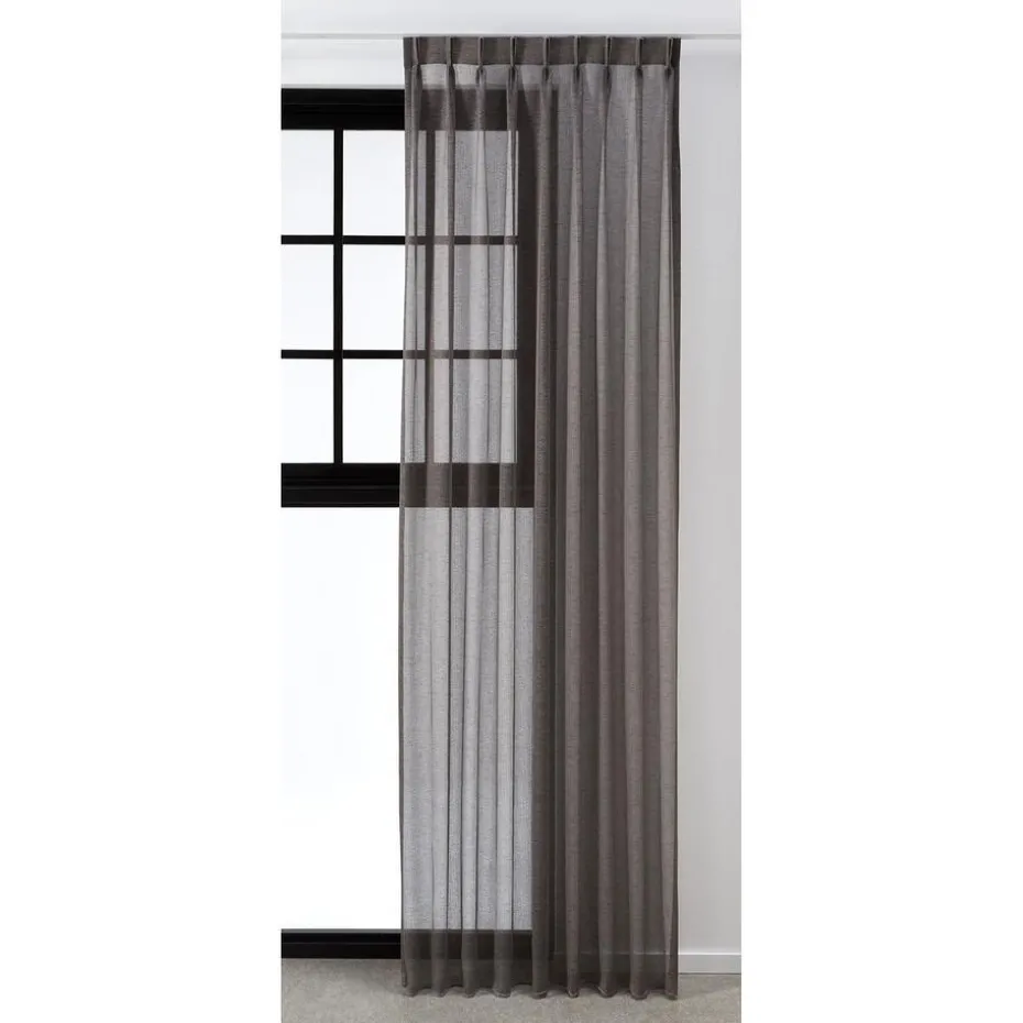 Transparante gordijnstof antracietkleurig. De lichtglanze stof heeft een subtiel opengewerkte structuur en een luxe uitstraling. Stevig, vormvast en soepel. Goed te combineren met een waveplooi maakwijze. 300 cm.