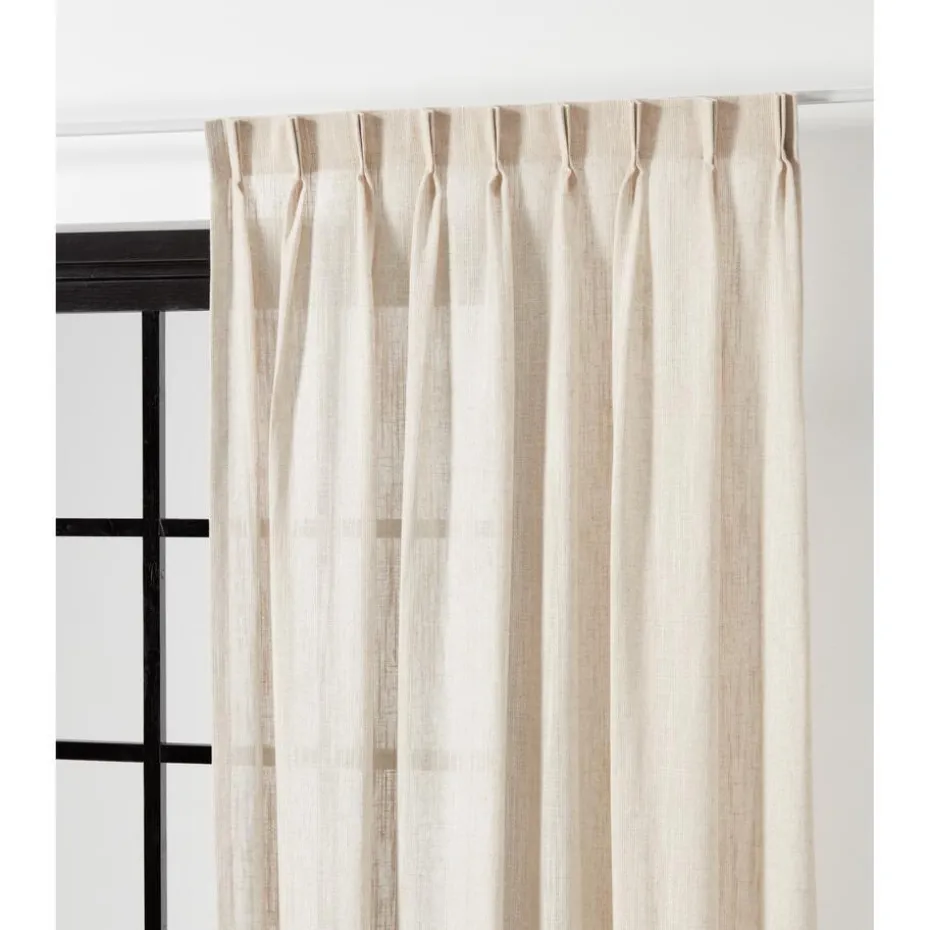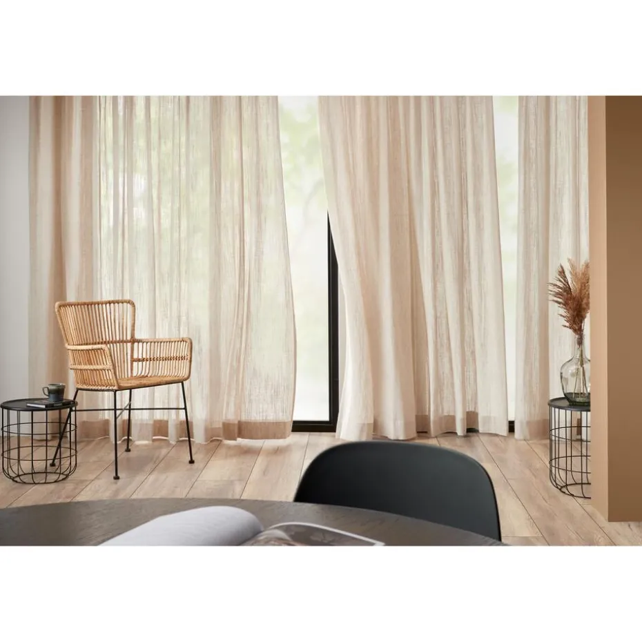 Inbetween Guus Naturel is een transparante gordijnstof van 40% viscose, 30% polyester en 30% linnen. Door de mix van materialen heeft Guus een soepel vallende, luchtige uitstraling. Gordijnen van natuurlijke materialen zijn prachtige sfeermakers in huis. Linnen is een natuurlijk materiaal dat bekend staat om zijn grove structuur. Iedere gordijnstof kent specifieke eigenschappen. Omdat linnen een natuurproduct is en uit natuurlijke vezels bestaat, gedraagt deze stof zich anders dan een polyester stof. Linnen heeft als bijzondere eigenschap dat het 20% van zijn eigen gewicht kan opnemen. Hierdoor kunnen de gordijnen iets korter of langer worden. Dit is afhankelijk van de vochtigheidsgraad in je huis. 300 cm hoog.