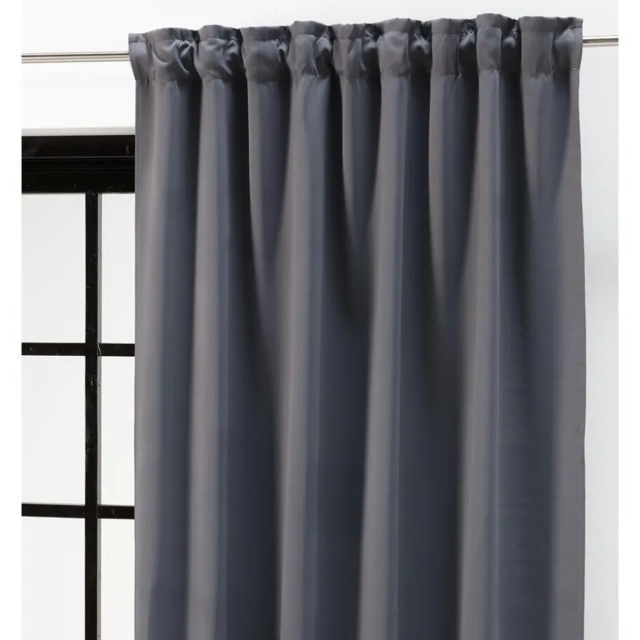 Kant en klaar gordijn gemaakt van glanzende antracietkleurige stof. Deels verduisterend. 140×260 cm (bxh).