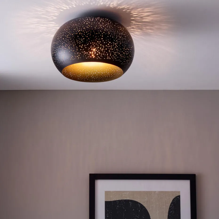 Plafondlamp Gemino in de kleur zwart. Heeft kleine gaatjes, waardoor dit een speels effect geeft in de ruimte. Gemaakt van 100% metaal. ø34×22,5 cm.