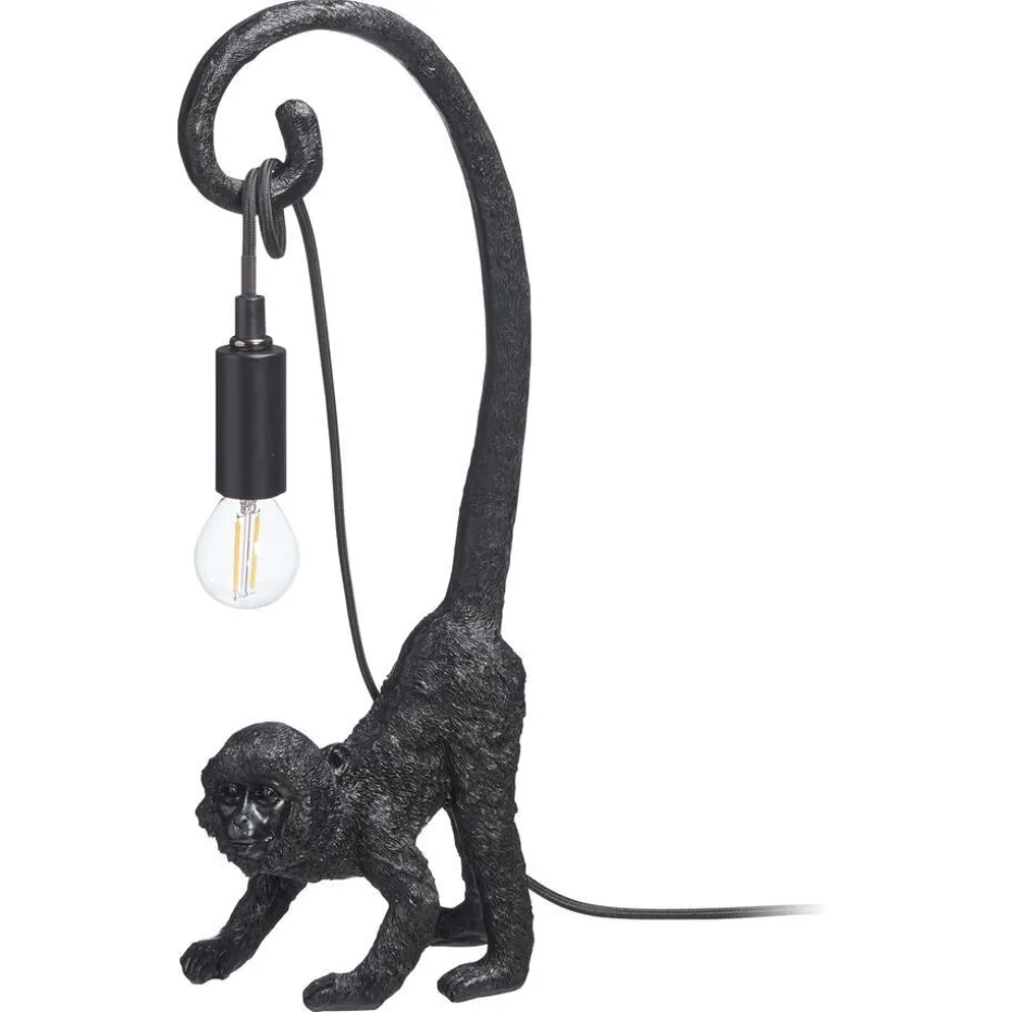 Tafellamp zwart in de vorm van een aap. Kleine fitting E14. Exclusief lichtbron. Maximaal 25 watt. 15x8x42 cm (lxbxh).
