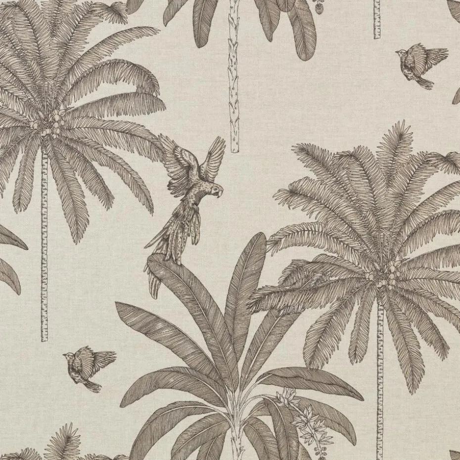 Zandkleurig tafelzeil met tropisch dessin van vogels en palmbomen. 140 cm breed.