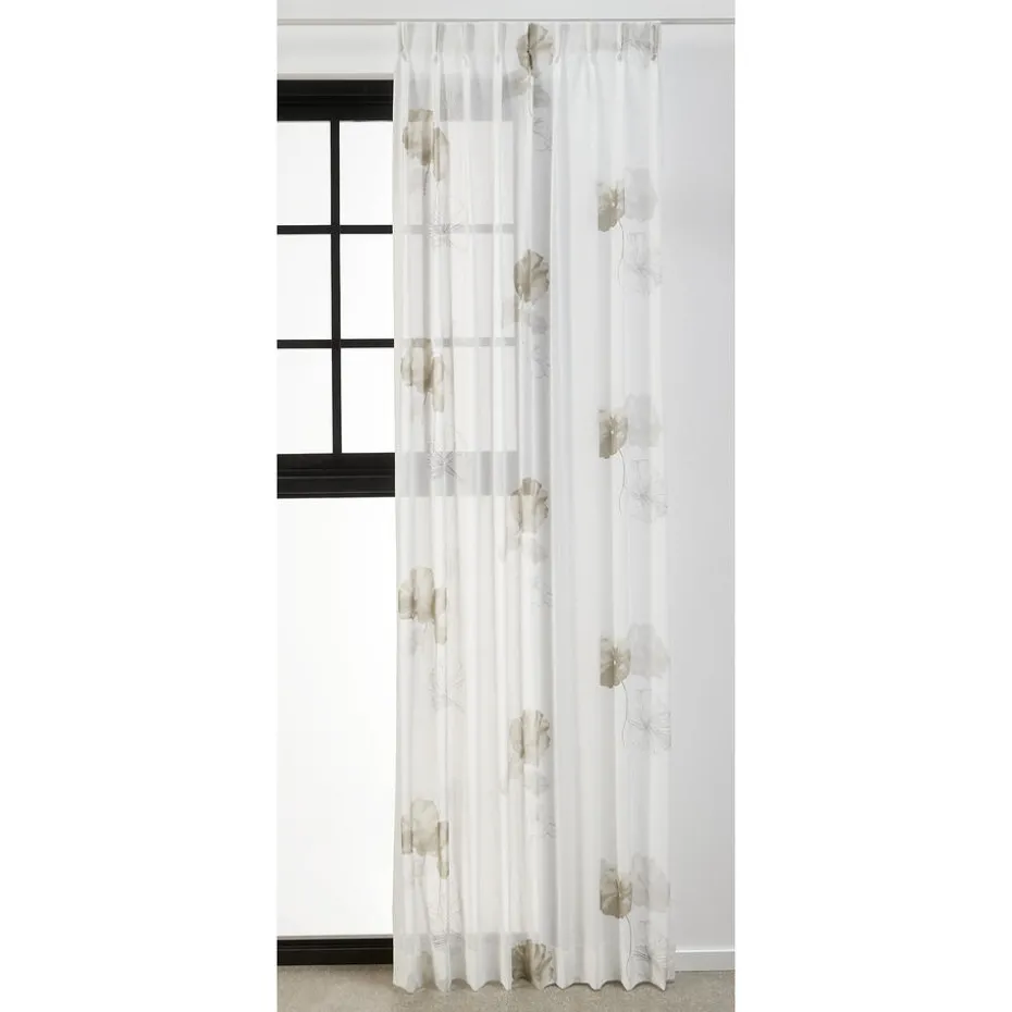 Vitrage Aukje in een witte kleur. Deze stof heeft een hele subtiele print van grijze bloemen. Gemaakt van 100% polyester. Patroonhoogte is 64 centimeter.