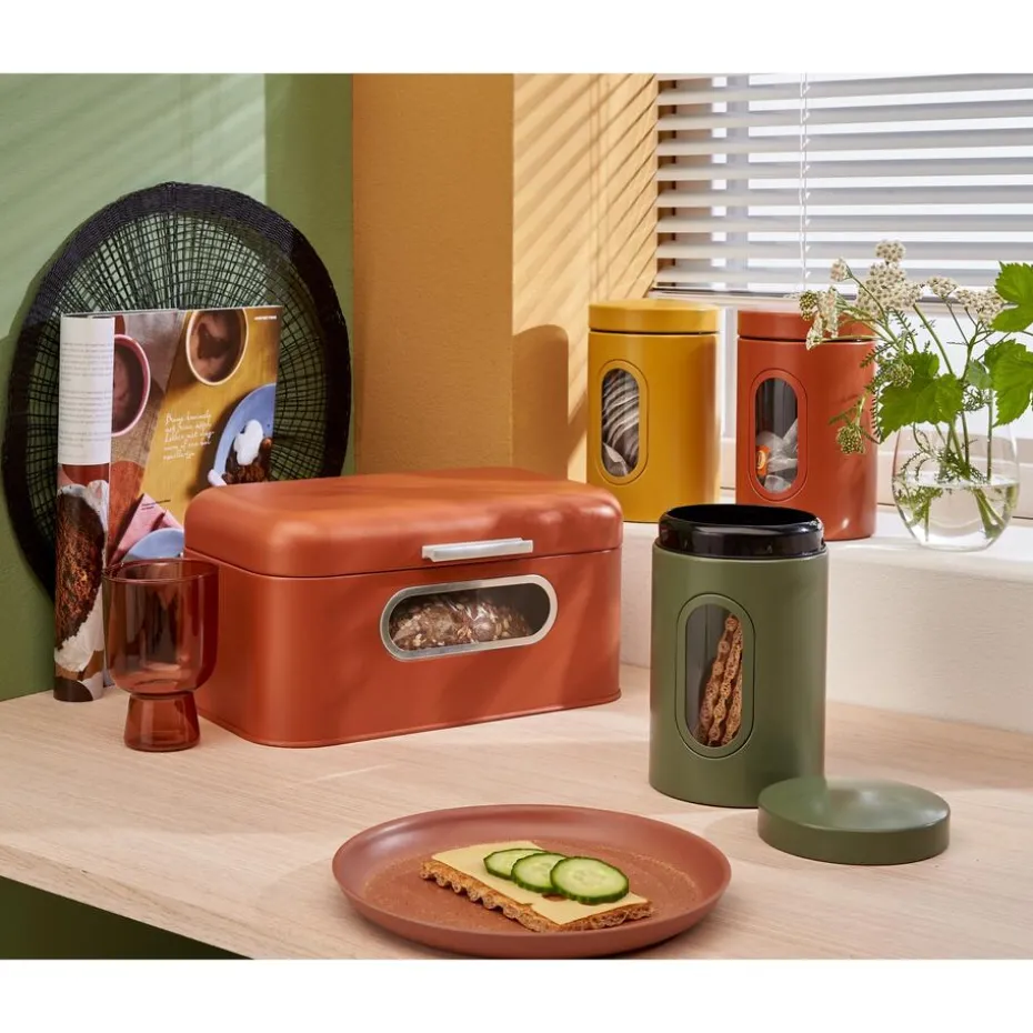 Metaal zwarte voorraadpot met venster. 17,2 cm hoog.