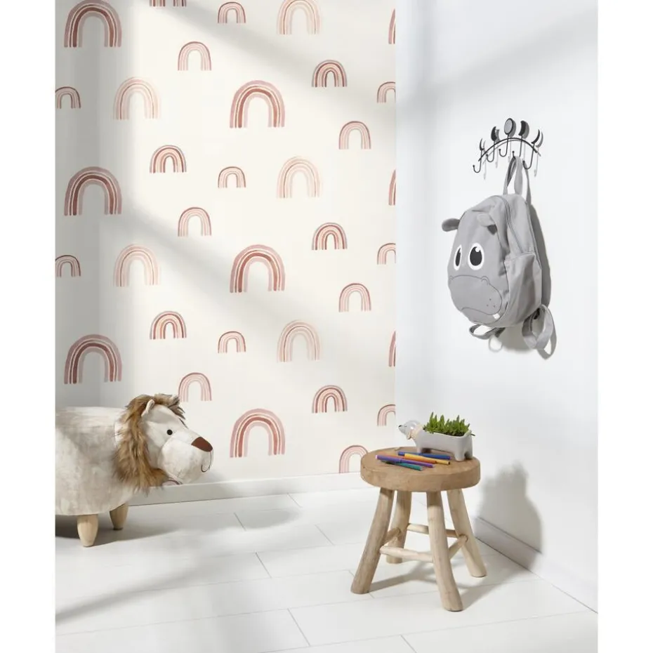 Wit vliesbehang met speelse regenbogen in bruine tinten. 53 cm breed. 10 meter per rol.