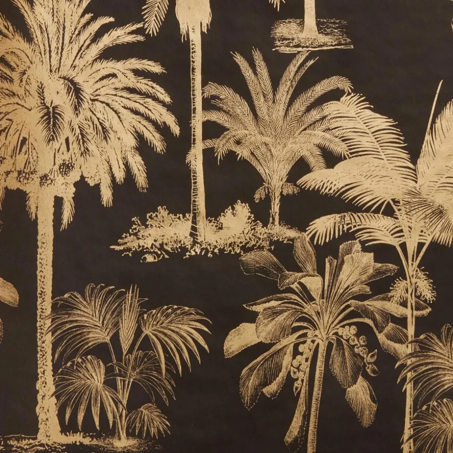 Zwart vliesbehang met tropisch dessin van palmbomen. Patroonhoogte: 53 cm. 10 meter per rol. Plakken met Perfax Roll-On.