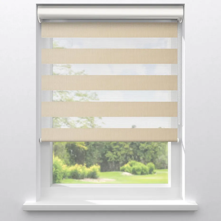 Duo rolgordijn Dean is in de kleur zand. Door middel van de polyester stof die is opgebouwd uit transparante en ondoorzichtige stroken, in combinatie met een ketting-systeem, kun je de lichtinval en privacy gemakkelijk bepalen in jouw woonkamer of keuken. Dankzij de stofeigenschappen van polyester is het duo rolgordijn makkelijk schoon te maken met een vochtige doek.
