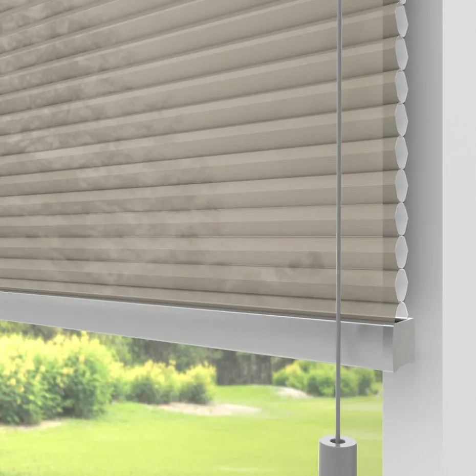 Lichtdoorlatende dubbele plissé zandkleurig met fijne structuur en witte achterzijde. De dubbel geplooide stof met een honingraatstructuur zorgt voor extra isolatie. De koorden zijn verwerkt in de honingraat en zijn niet zichtbaar. Verkrijgbaar als top down, top down bottom up of top down bottom up gespannen. Een top down bottom up gordijn kan zowel aan de bovenkant als de onderkant worden uitgevouwen voor volledige controle over de gewenste lichtinval en privacy. Een gespannen plissé is zeer geschikt voor draaikiepramen omdat de stof goed op zijn plek blijft. Op maat te maken en volledig naar wens samen te stellen. Bepaal zelf de kleur van het systeem en kies uit een bijpassende koordhanger van kunststof, rvs of zwart metaal.