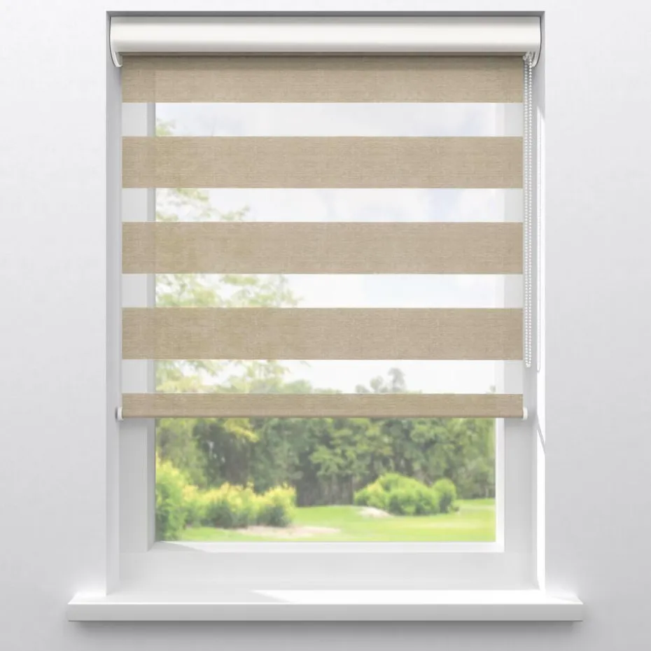 Lichtdoorlatend duo-rolgordijn naturel. De transparante banen hebben een fijne gaasstructuur. De afwisselende open en dichte stofbanen bewegen voor elkaar langs. Zo bepaal je eenvoudig de lichtinval en privacy. Je kunt zelf de kleur kiezen van de cassettes, eindkappen, kettingen, onderlatten en roedes. De bedieningszijde kies je ook zelf: rechts of links. Op maat te maken en eenvoudig met de juiste afmetingen te bestellen.