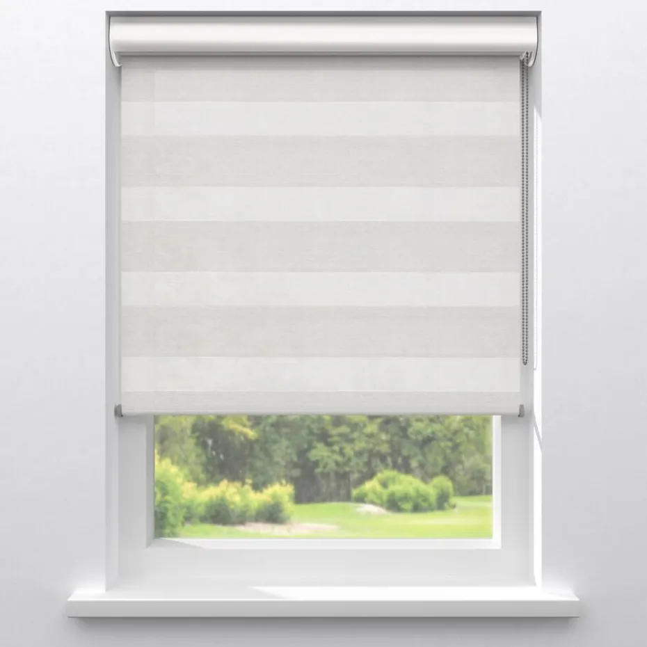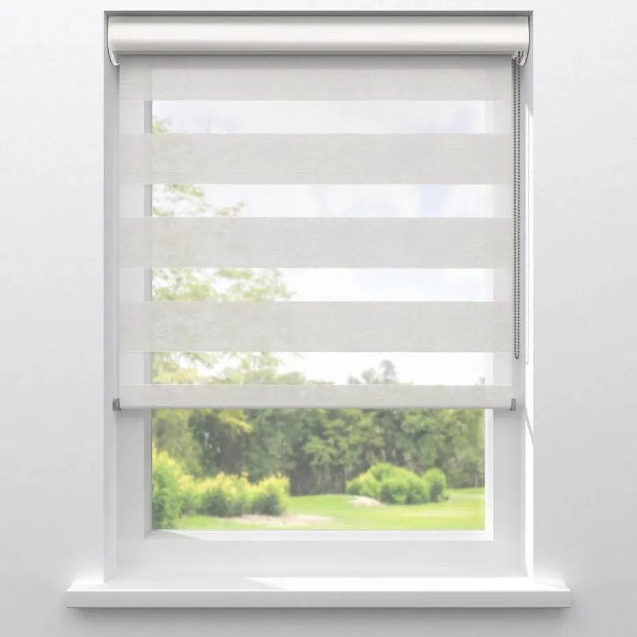Lichtdoorlatend duo-rolgordijn wit. De transparante banen hebben een fijne gaasstructuur. De afwisselende open en dichte stofbanen bewegen voor elkaar langs. Zo bepaal je eenvoudig de lichtinval en privacy. Je kunt zelf de kleur kiezen van de cassettes, eindkappen, kettingen, onderlatten en roedes. De bedieningszijde kies je ook zelf: rechts of links. Op maat te maken en eenvoudig met de juiste afmetingen te bestellen.
