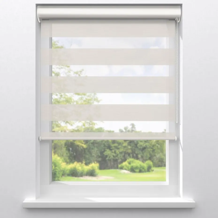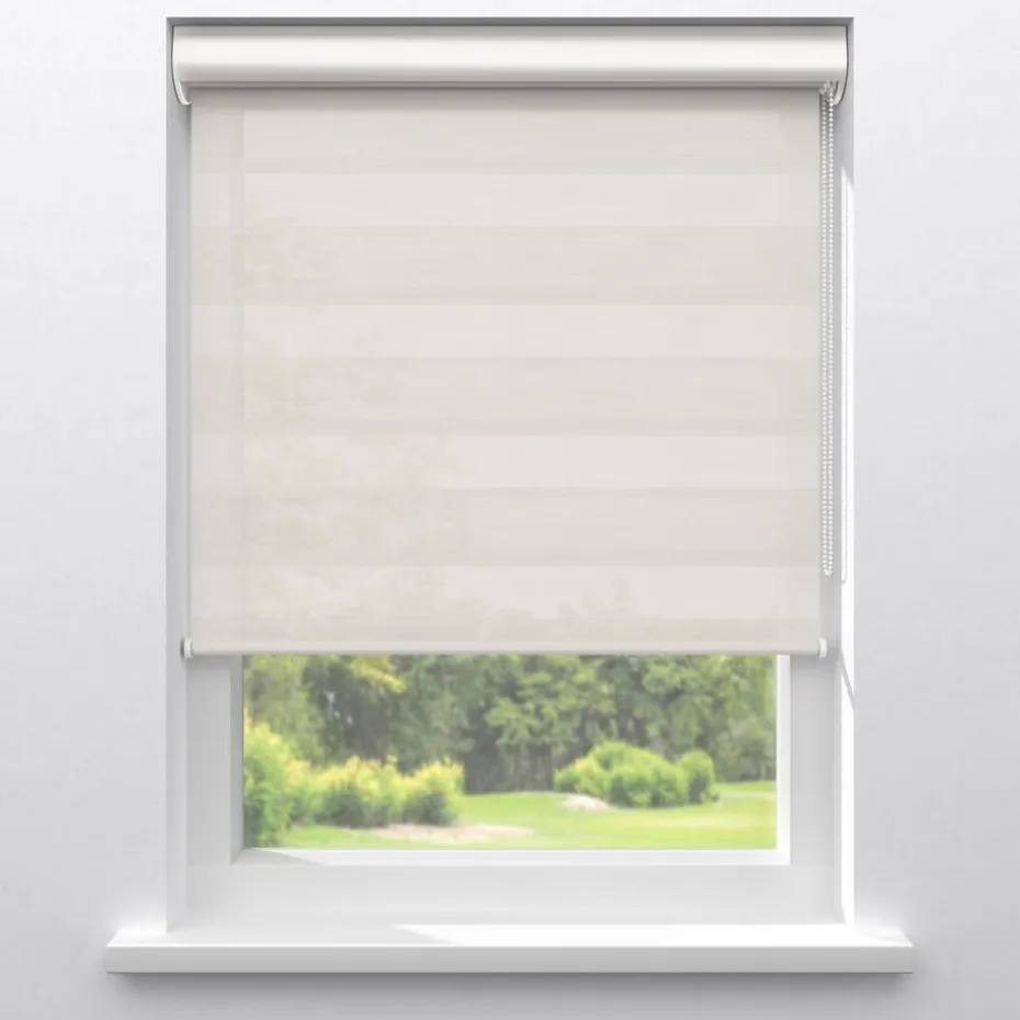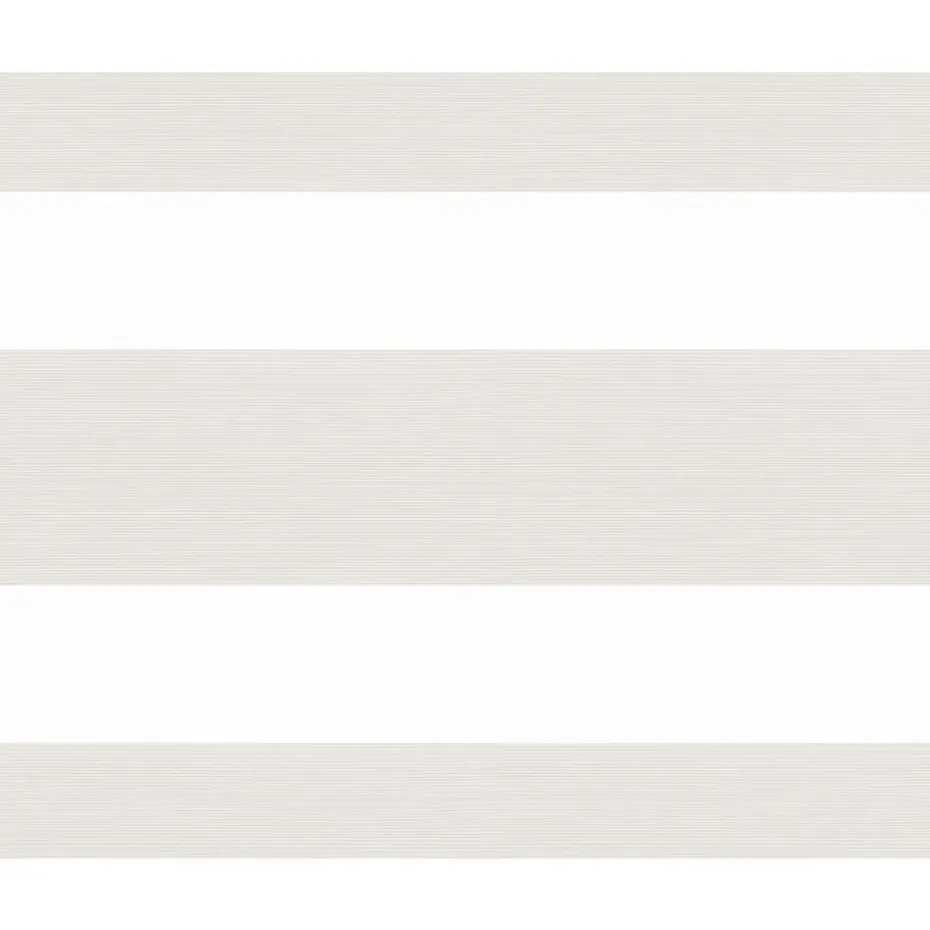Lichtdoorlatend duo-rolgordijn off-white met streep dessin. De transparante banen hebben een grovere gaasstructuur. De afwisselende open en dichte stofbanen bewegen voor elkaar langs. Zo bepaal je eenvoudig de lichtinval en privacy. Je kunt zelf de kleur kiezen van de cassettes, eindkappen, kettingen, onderlatten en roedes. De bedieningszijde kies je ook zelf: rechts of links. Op maat te maken en eenvoudig met de juiste afmetingen te bestellen.