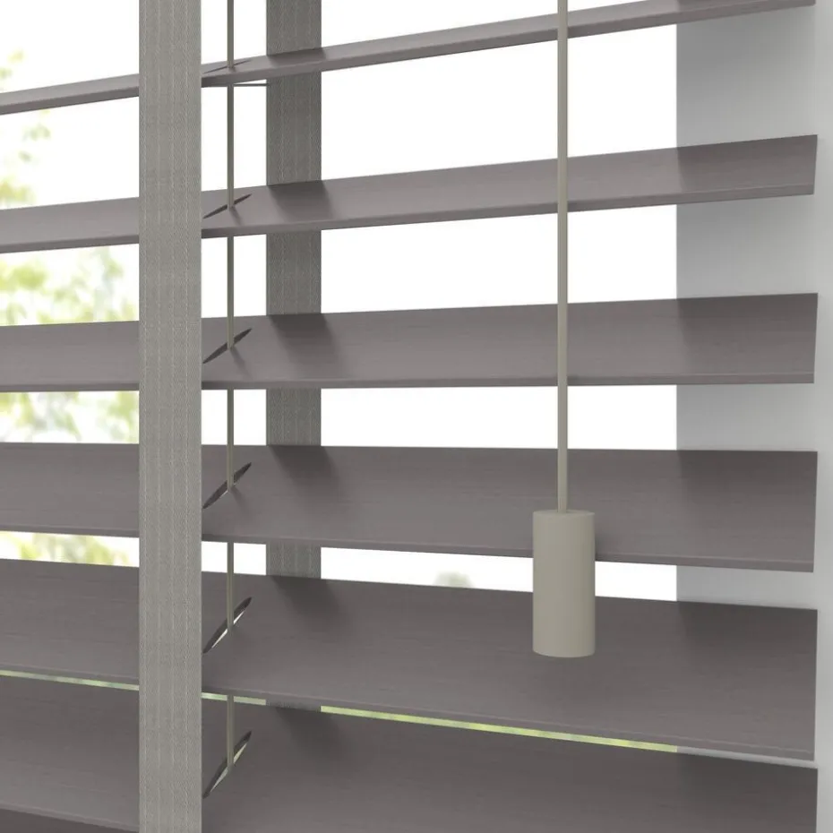 Houten jaloezie grijs met natuurlijke houtnerven en luxe uitstraling. 100% hout. De brede lamellen van 50 mm zorgen voor veel lichtinval en bieden veel privacy wanneer je deze sluit. Op maat te maken en volledig naar wens samen te stellen. Bepaal zelf de bedieningszijde en kies uit diverse accessoires en uitvoeringen. Keuze uit een bijpassend ladderkoord, 48 verschillende ladderbanden en een koordhanger van hout, rvs of zwart metaal.