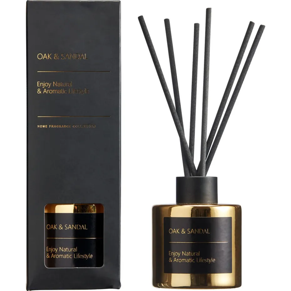 Geurstokjes in de geur sandalwood. Goud met zwart kleurige houder.