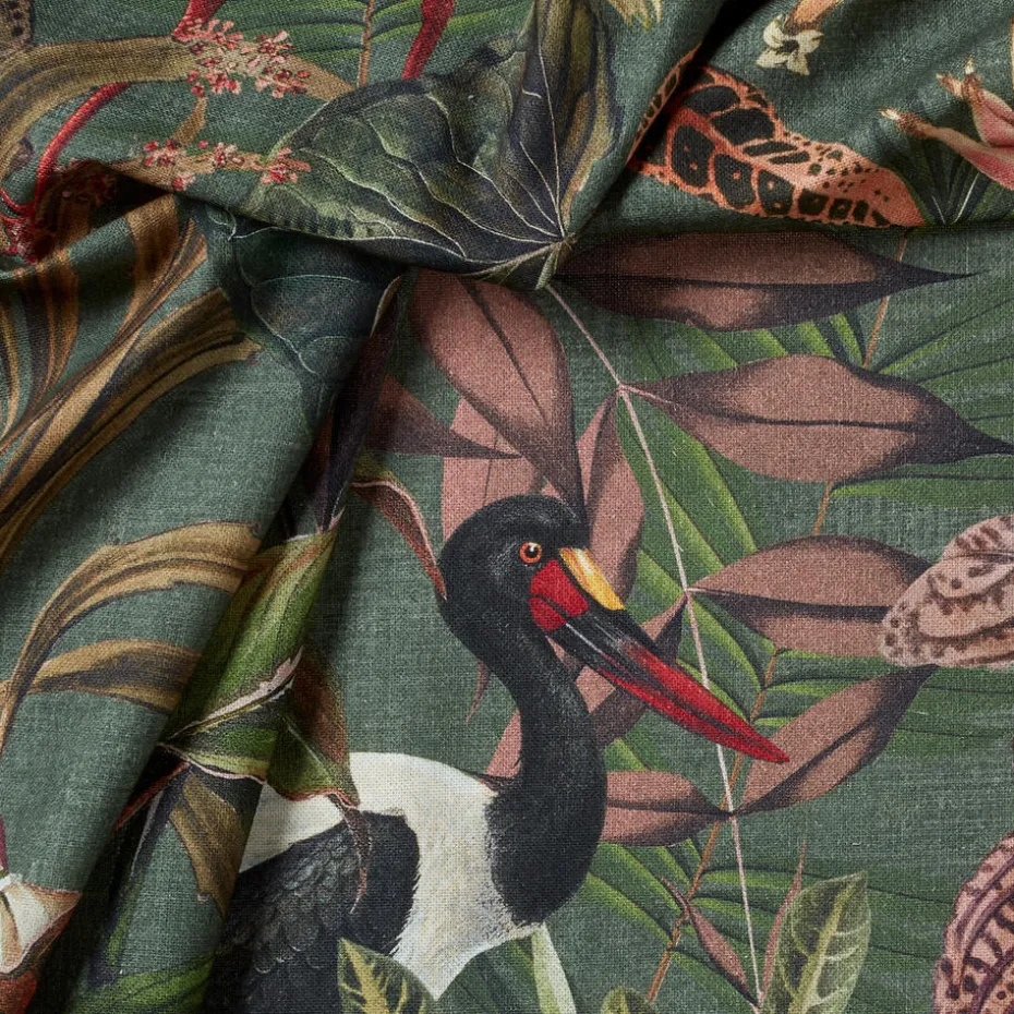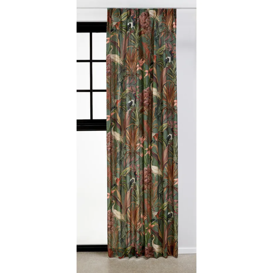 Gordijn Moniek in een groene kleur met een tropische print. Gemaakt van 100% katoen. 140 cm breed.