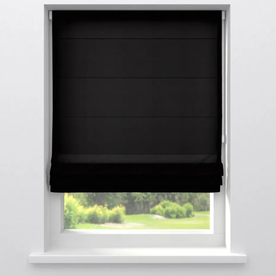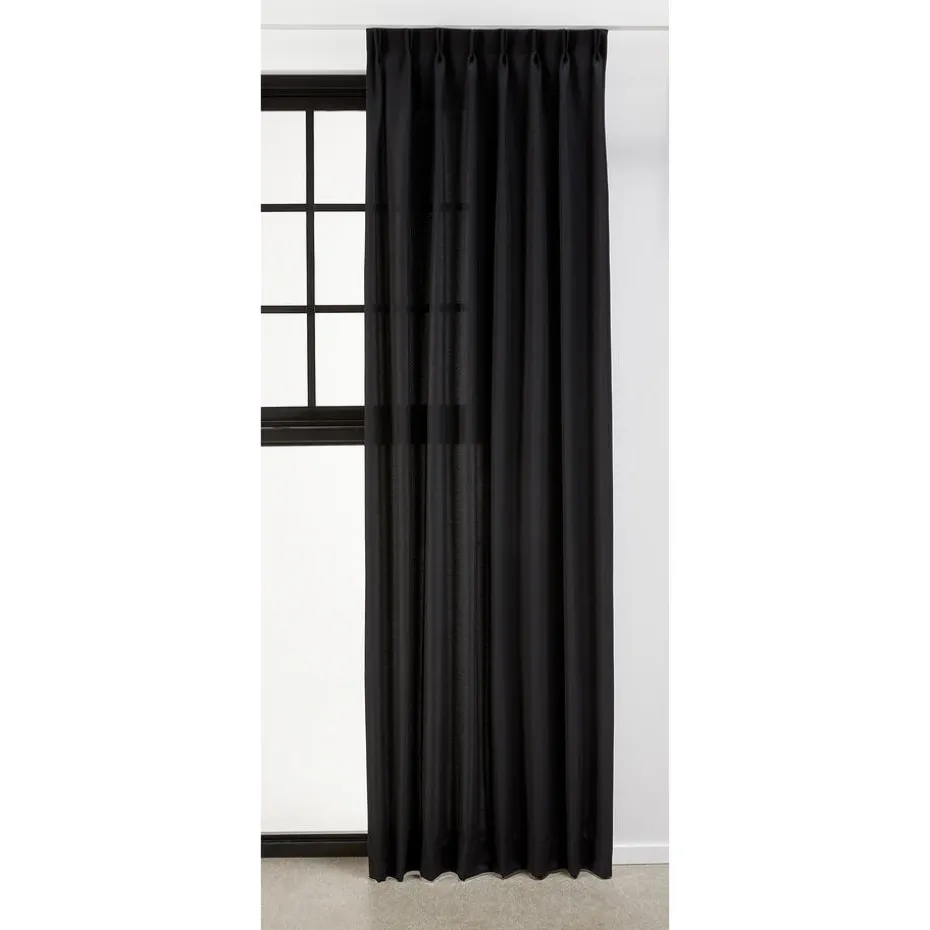 Lichtdoorlatende zwarte uni gordijnstof. Dit gordijn is stevig, vormvast en valt soepel. De stof is gemaakt van 100% polyester. 150 cm breed.
