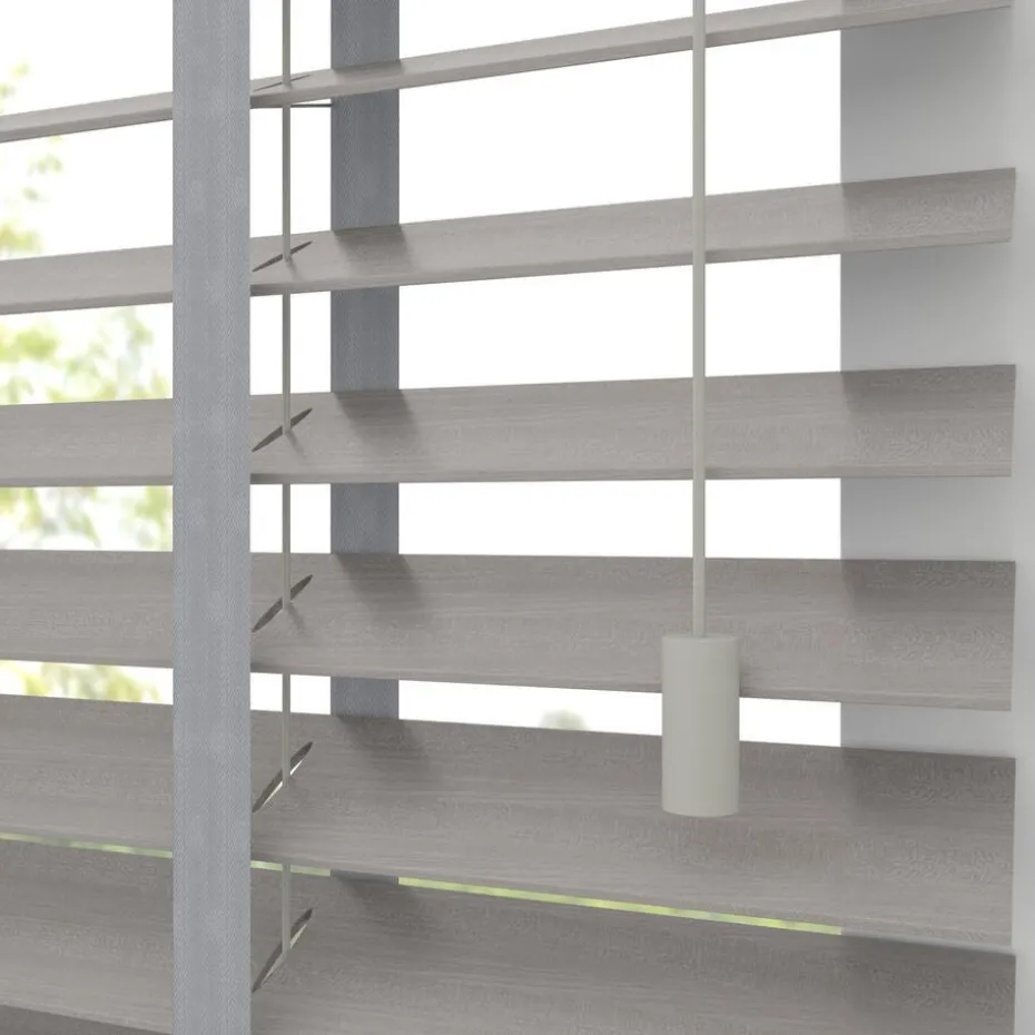 PVC houtlook jaloezie grijs. Nauwelijks van echt hout te onderscheiden met de voordelen van PVC. Deze jaloezie is vochtbestendig en ook geschikt voor vochtige ruimtes zoals badkamers en keukens. De brede lamellen van 50 mm zorgen voor veel lichtinval en bieden veel privacy wanneer je deze sluit. De bedieningszijde is rechts en links is de tuimelzijde. Op maat te maken en standaard uitgevoerd met een ladderkoord en een bijpassende koordhanger.