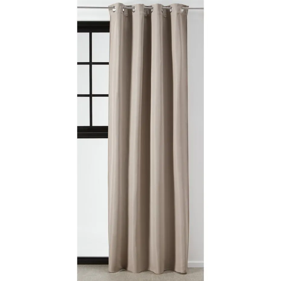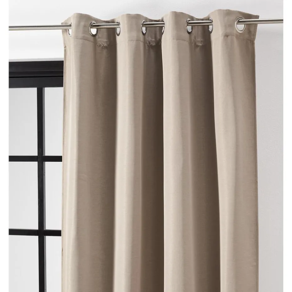 Kant en klaar ringgordijn van stevige zandkleurige stof. Soepelvallend en kreukherstellend. 135 cm breed.