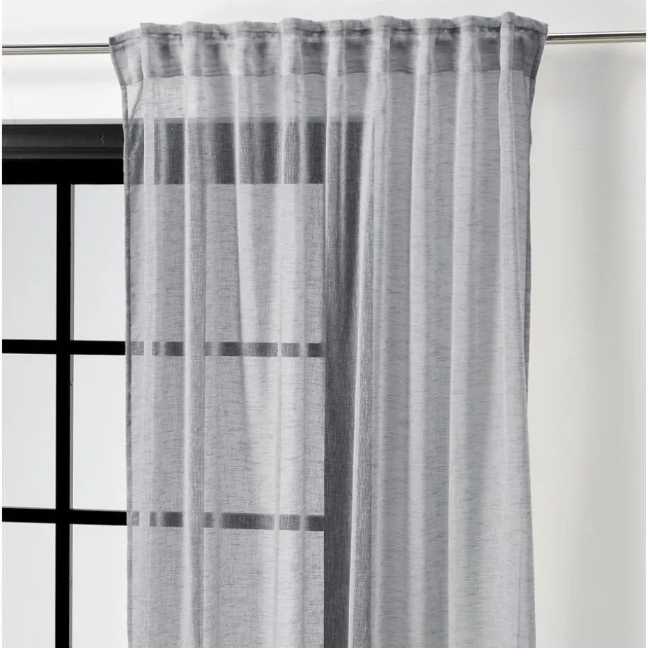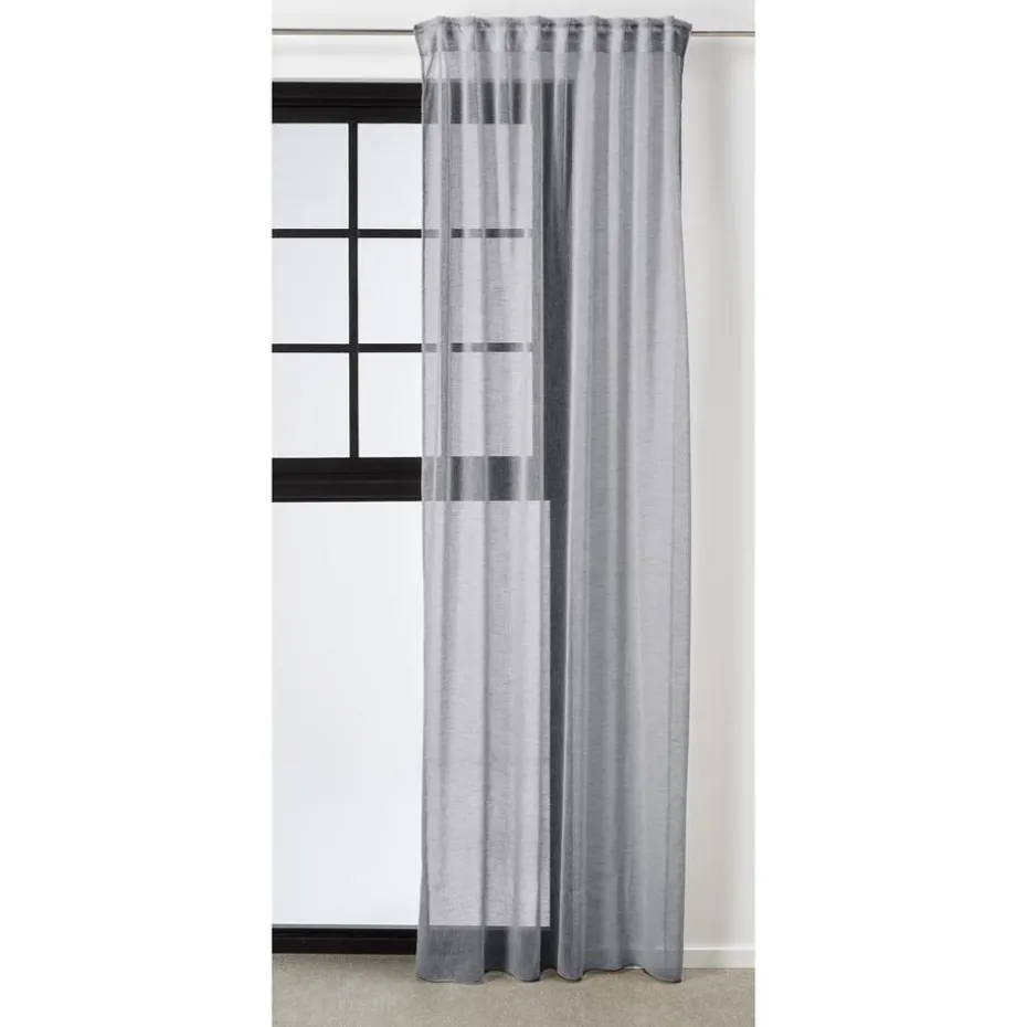 Kant en klaar gordijn van luchtige antracietkleurige stof met plooiband en lussen. Soepelvallend en kreukherstellend. 135 cm breed.