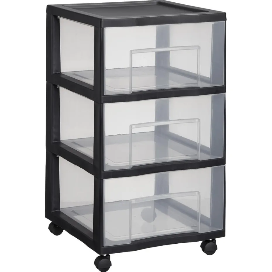 Ladekast zwart op wielen met 3 transparante lades. De lades hebben brede handgrepen en door het transparante materiaal zie je in één oogopslag wat je zoekt. Licht in gewicht, makkelijk te reinigen en duurzaam. Gemaakt van gerecycled kunststof (50%). 38,5x37x64 cm (lxbxh).