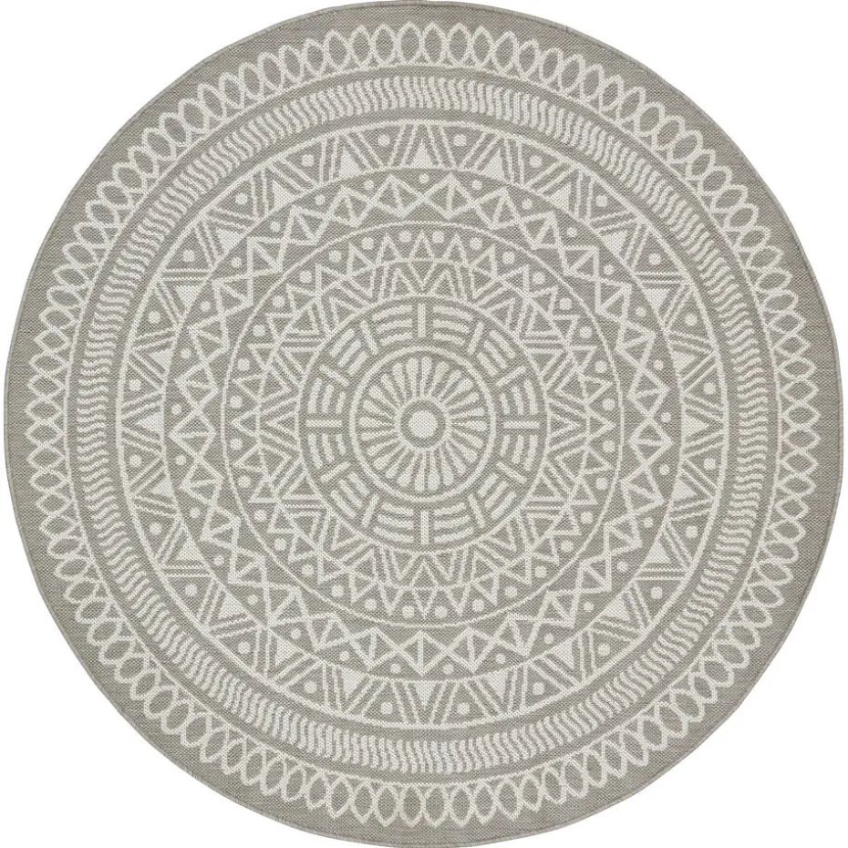 Rino is een rond vloerkleed die stijl en warmte toevoegt aan elke kamer. Met zijn lichte grijze kleur en opvallende Aztec print geeft dit vloerkleed een eigentijdse touch aan je interieur. De laagpolige textuur zorgt voor comfort en maakt dit kleed perfect geschikt voor drukbezochte ruimtes.