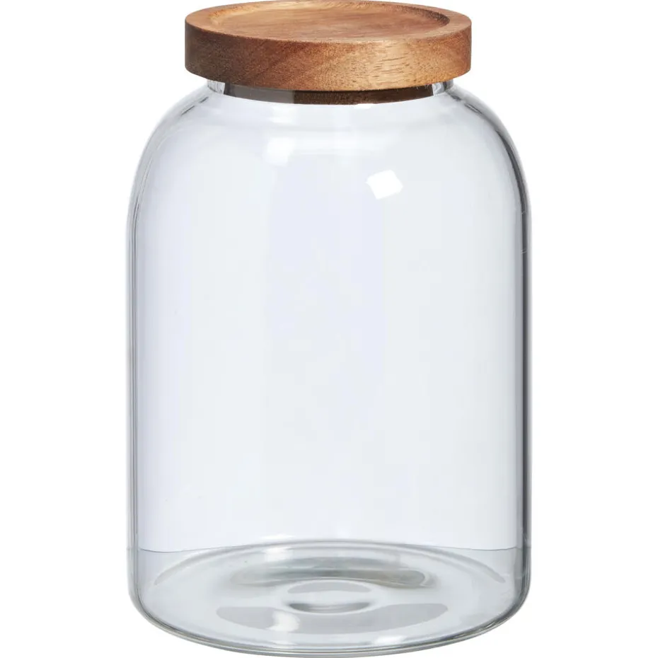 De transparante Acacia voorraadpot is voorzien van een houten deksel, ideaal voor het bewaren en opslaan van je voorraad.Deze stijlvolle glazen pot combineert elegantie en functionaliteit, waardoor je ingrediënten vers blijven en je keuken georganiseerd is.